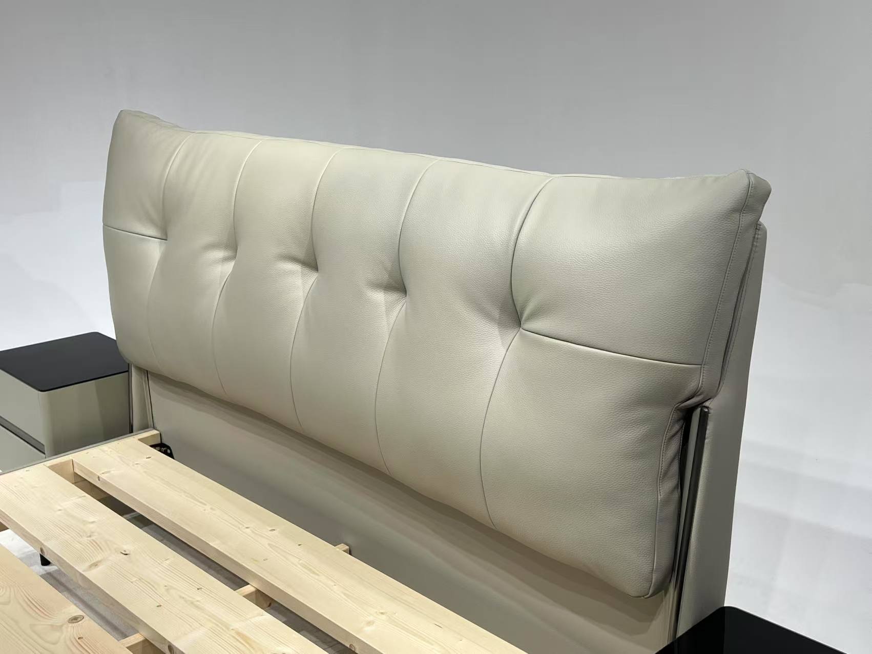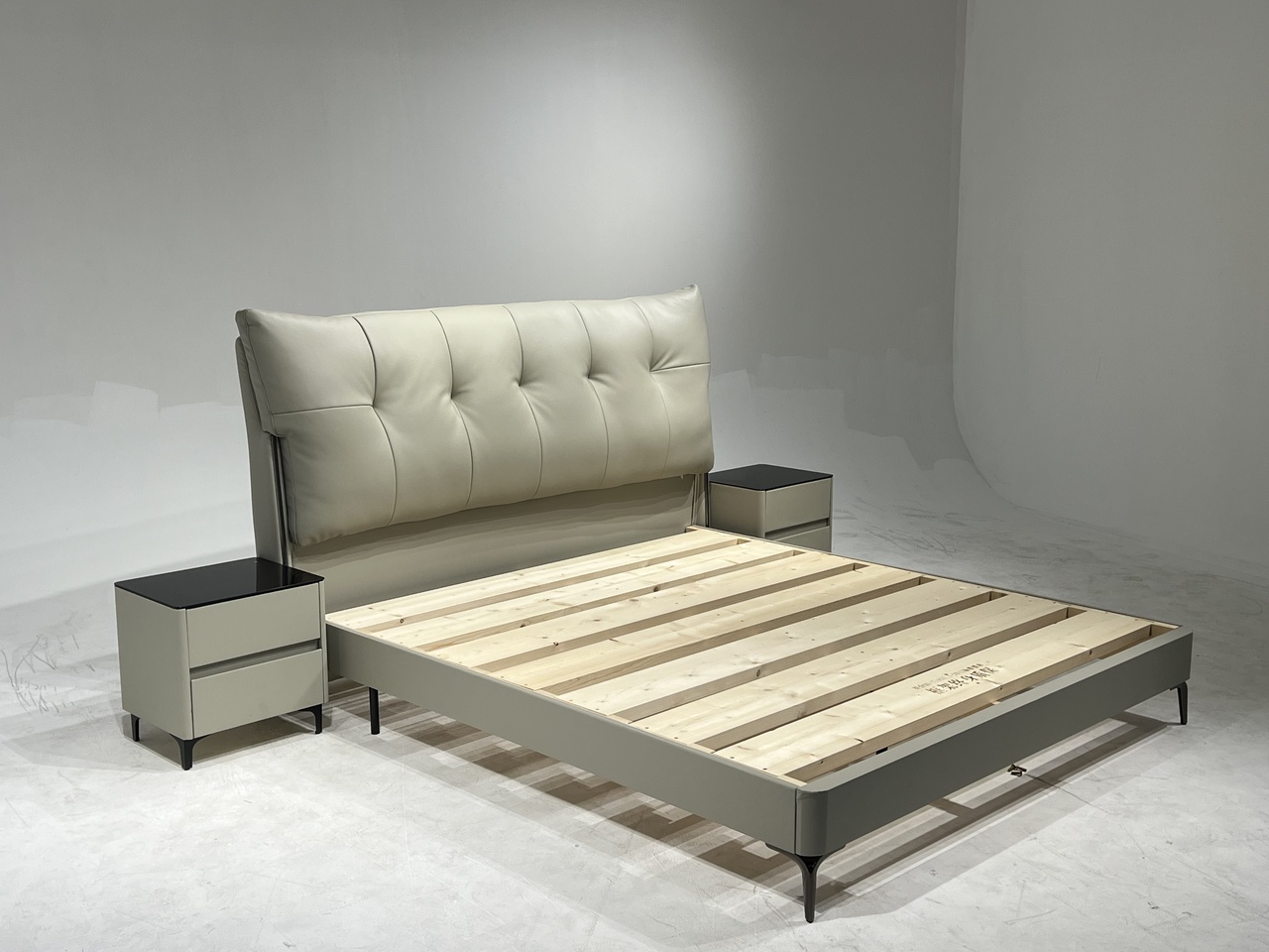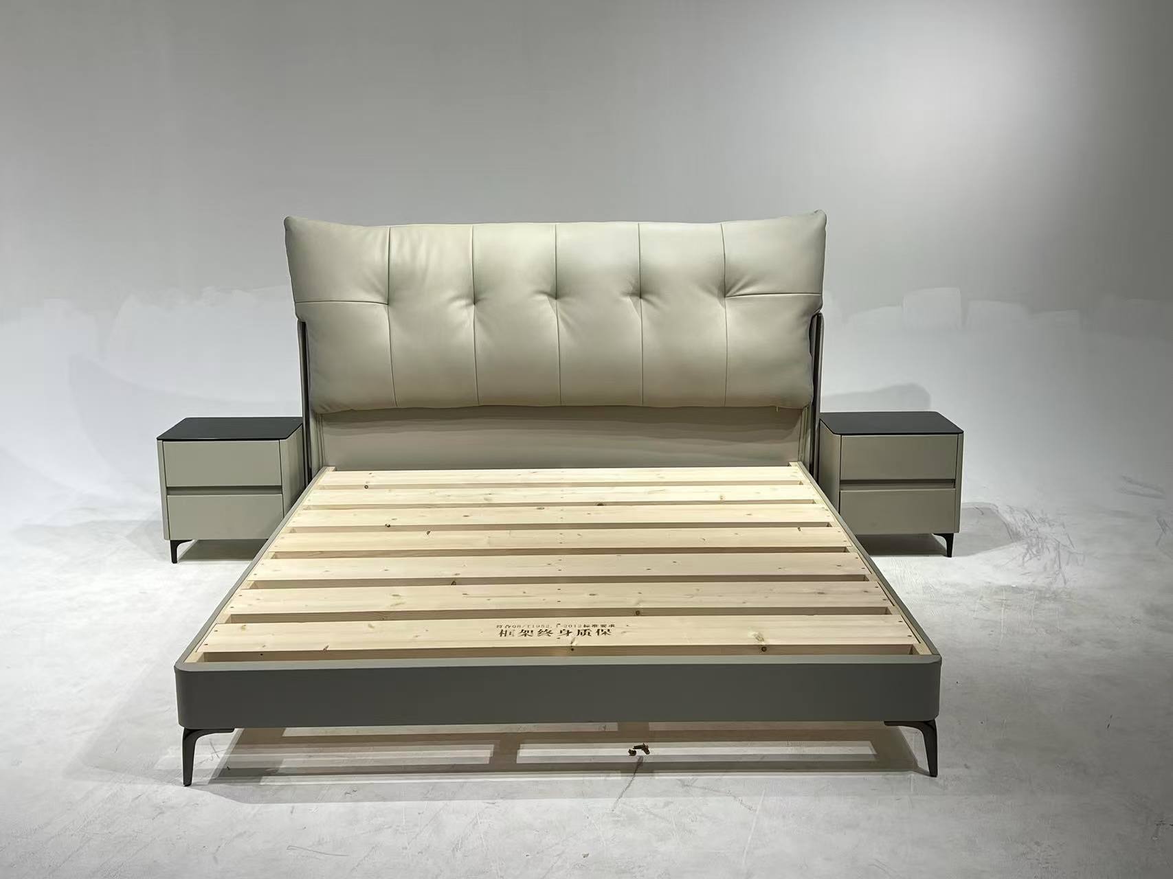 备注:5公分松木边,4公分松木板,2.0厚生态真皮,软包款,配两个黑玻柜。床头宽197