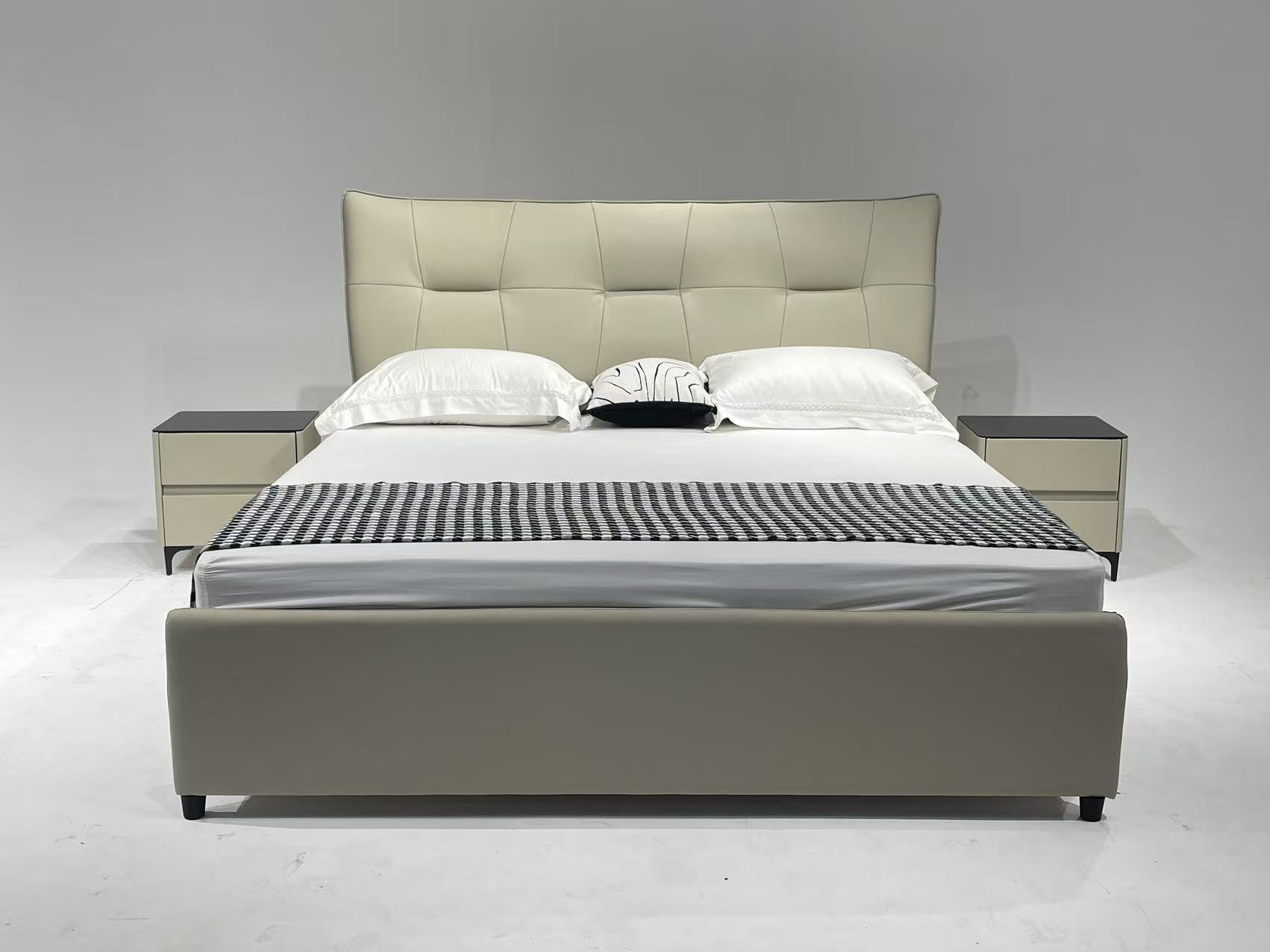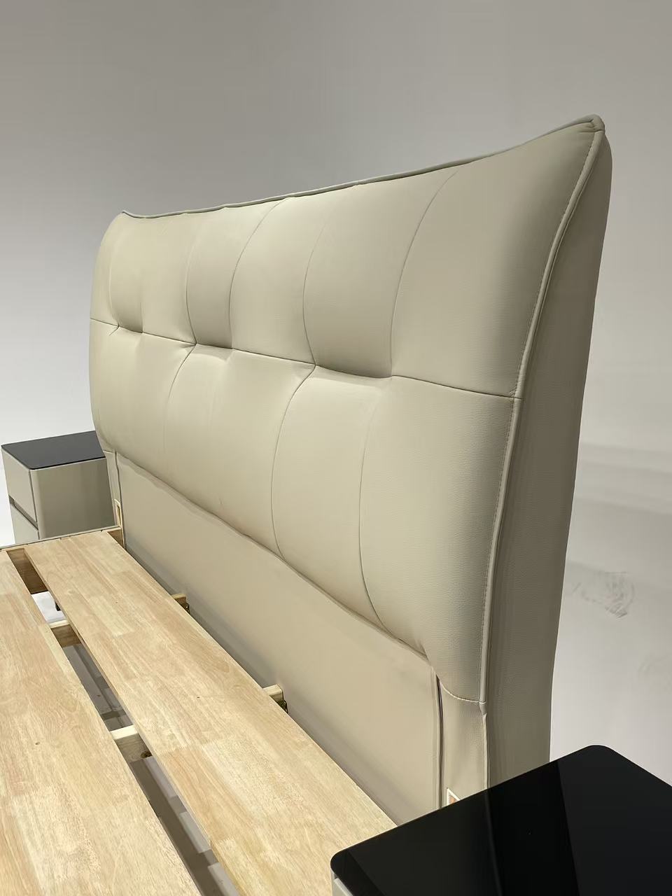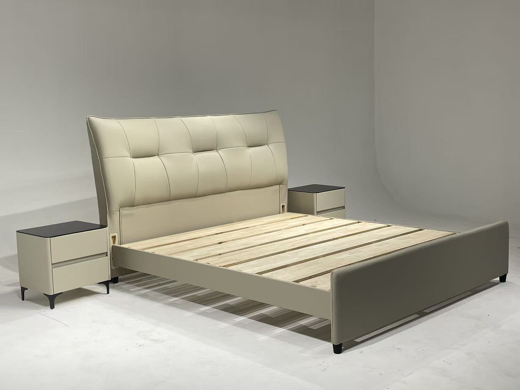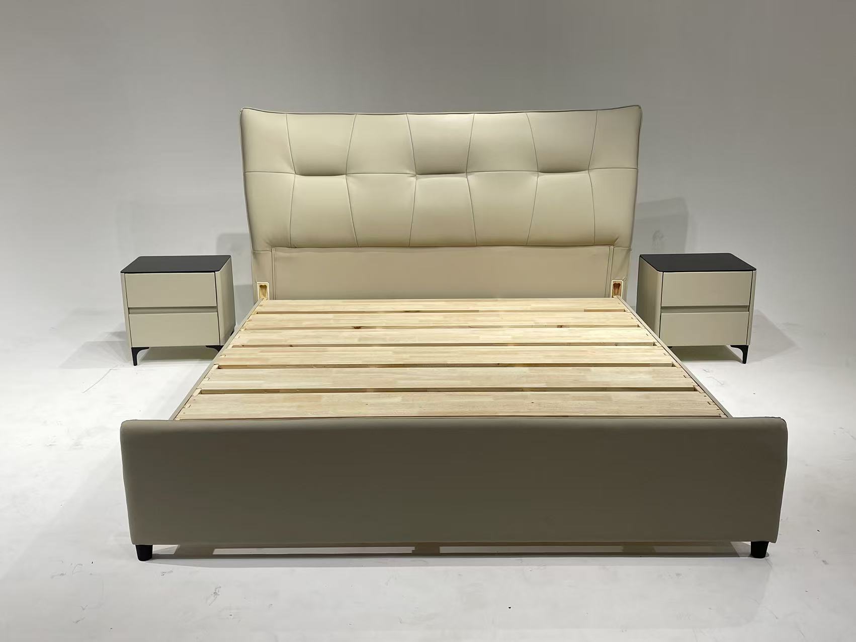 备注:配置:靠包采用高回弹海绵填充亲肤生态真皮,4公分实木床边,全实木床板,榫卯上下可调节,标配2个黑玻璃柜,1.8厚全实木床板7块,床头宽195